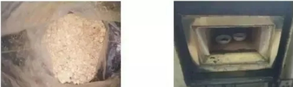 調(diào)研過多家醫(yī)藥化工企業(yè)RTO爐,發(fā)現(xiàn)大部分企業(yè)RTO爐在運行一段時間后,蓄熱床層底部有二次污染物大量積聚(如圖2)、黏附現(xiàn)象,易造成蓄熱床層底部堵塞,引發(fā)火災(zāi)等安全事故。以某醫(yī)藥企業(yè)為例,經(jīng)過取樣試驗分析發(fā)現(xiàn),該二次污染物具有以下特性: